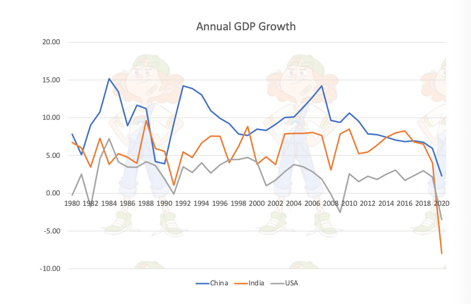 As the chart above shows, the Indian economy was slowing even before the pandemic. The COVID-19 shutdown cratered the GDP by 28% in the first quarter of 2020-21, taking it to 7.3% for the whole year.
