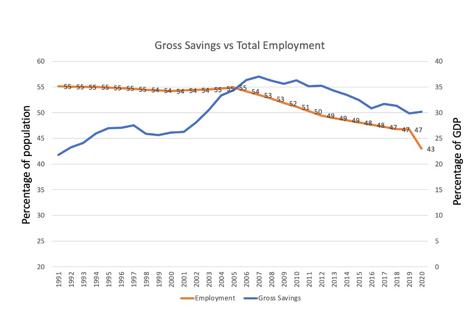 Our gross savings rate as a percentage has been declining for years. One reason for this of course in the structural increase in unemployed as a proportion of the total workforce, a figure we take enormous care to ignore. But the correlation between the two is unmistakable, as the following graph shows.