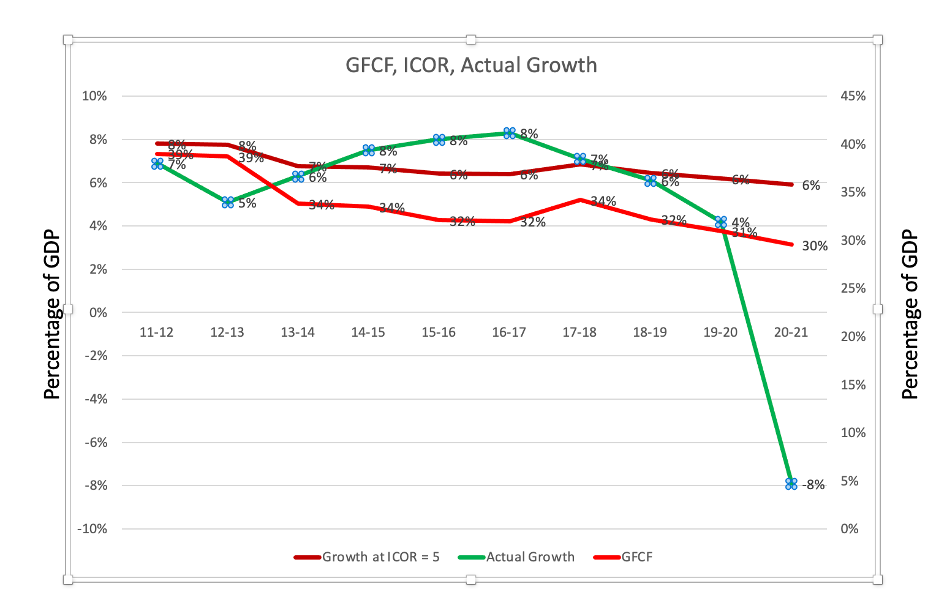 GFCF is the key determinant of future growth in any economy, and the Indian case is no different. Every 5 units of GFCF produces an incremental growth of 1 unit of GDP, India’s ICOR being 5. The ratio is unusually volatile but in the period under review it produces a remarkably consistent set of results as shown in the following graph.