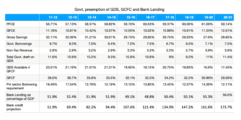The totality of such savings available to the private sector for new investment have ranged from 20.51% of GDP [39% of GDP] in 2011-12 to 17.45% of GDP [29.56%] in 2020-21. The figures in bracket are the GFCF for that year. It shows that the private sector requirements of funds are roughly 2X times the gross savings available to the private sector after Govt. preemption. [GFCF includes public sector capital formation, that is internal to PSUs and is therefore treated just as private GFCF.]