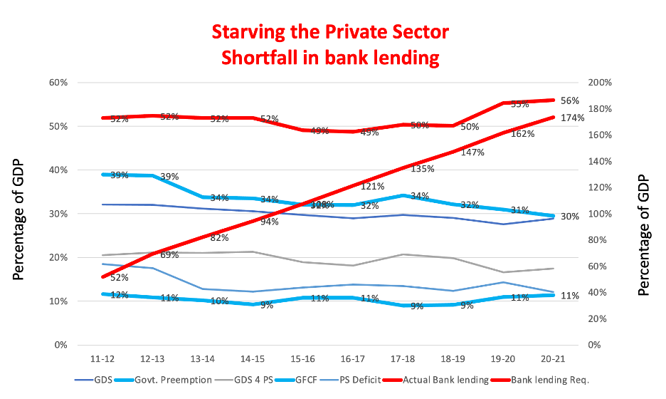 The two red lines put the whole problem in a nutshell. The flat line shows actual bank lending as per Y axis on the left, while the steep upward sloping red one running to the right Y-axis shows the total bank lending required to support private sector GFCF as percentage of GDP. The humongous gap between the two, shows how the private sector is denied credit in the domestic economy to fund its new investments.