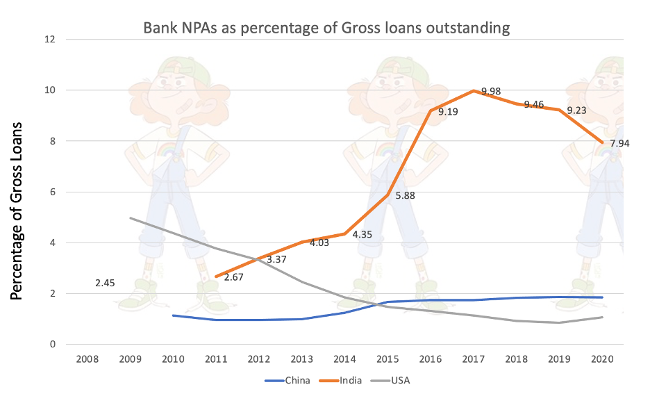 A look at the chart showing percentage of NPAs of to gross loans from the banking sector explains the choking of credit to the real economy 2014, when the NPAs shot up from 4.35% of the loans outstanding to 10% in 2017. They have come down since but are still high at 8% of loans outstanding, making expansion of their balance sheets very difficult.