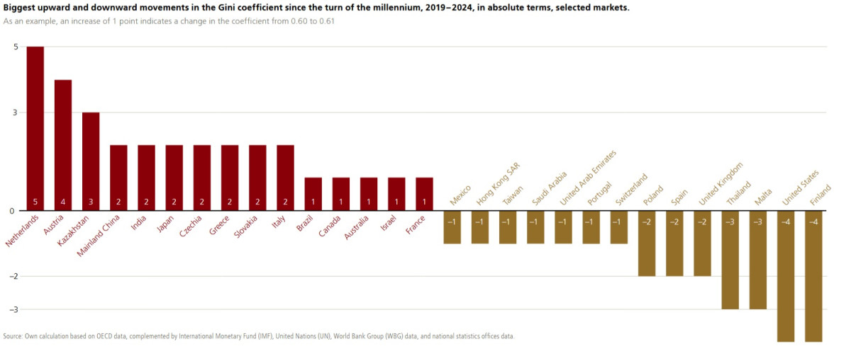 India is among the most unequal countries in the report's sample of 56 nations and among the 15 highlighted in the report where inequality increased over 2019-2024. Inequality, according to UBS's research, fell in Finland and the United States the most, and rose in the Netherlands and Austria the most.