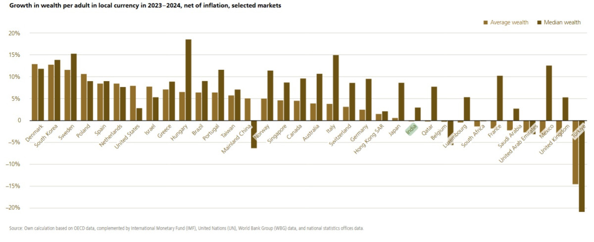 India's real average wealth per adult declined in 2024 compared with 2023. India remained in the negative territory when wealth was measured in local currency.