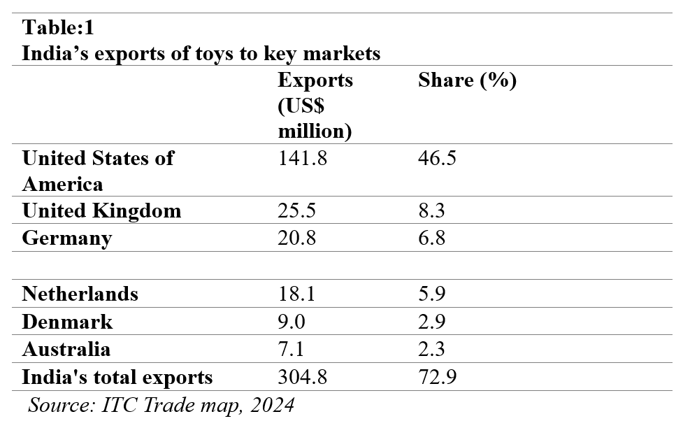 The broad trends of toy exports and imports demonstrate that the country has turned into a net exporter of toys. In terms of export markets, India’s toy exports are mainly to developed economies. More than 70% of toy exports are to the United States, the UK, Germany, the Netherlands, Denmark and Australia (Table 1).