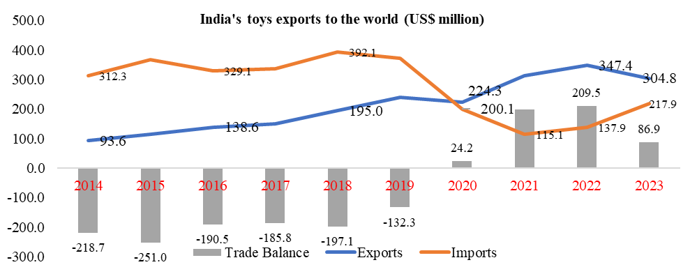 Exports of the toy sector have witnessed a significant rise 2020 onwards. The total exports of the toy sector were $224.3 million in 2020 and reached $304.8 million in 2023. On the other hand, imports were $200.1 million in 2020 and reached $217.9 million in 2023 (Figure 1). However, imports experienced a sharp decline in 2021 and 2022.