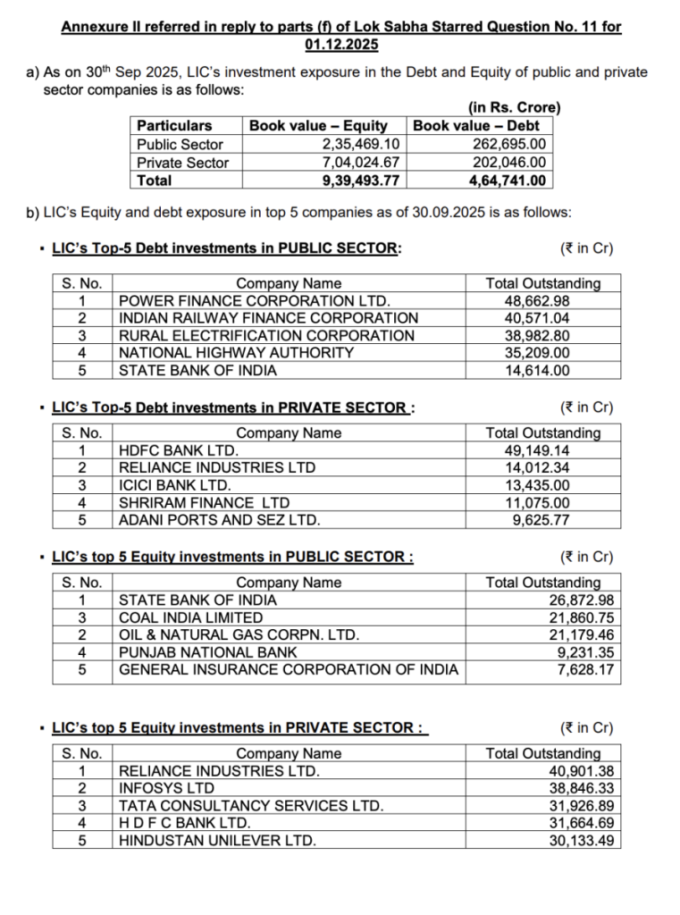 The government's reply has said that broadly, LIC's investments reflect "that it invests in the top 500 companies listed on NSE and BSE and a major portion of LIC’s investment currently is in the larger companies out of these." The book value of LIC’s investment in Nifty 50 companies, according to the government, as on September 30, 2025, is Rs 4,30,776.97 crore, which is 45.85% of its total equity investment.