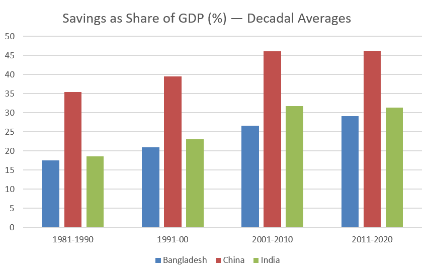 Moreover, it is noteworthy that despite a deceleration in the economic growth rate in China between 2011-2020, in the aftermath of the global financial crisis and the Great Recession, the investment rate has continued to grow, which has laid a stronger foundation for growth in the next decade. The savings rate in China has also remained over the investment rate since 1991, which reflects massive mobilisation of domestic resources for investment, which could not be achieved without active interventions of the state, like the belt and road initiative. Bangladesh has also witnessed growth acceleration between 2011-2020, accompanied by significant improvements in its investment and savings rates.