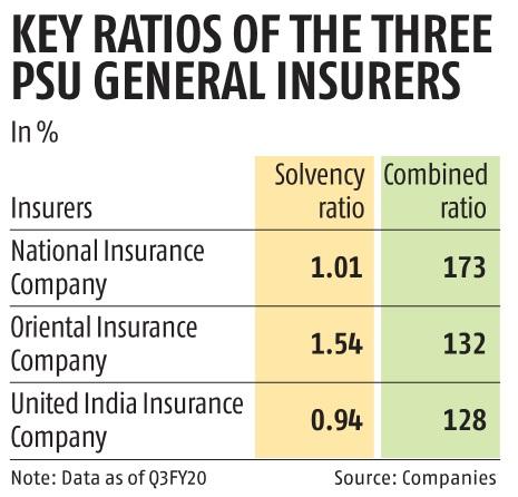 As of the third quarter of 2019-20, National Insurance had a solvency ratio of 1.01, against the regulatory requirement of 1.5. Solvency ratio is a key indicator of financial health. Its combined ratio — a measure of profitability for non-life insurers — stood at 173%. If the ratio is below 100, it indicates that the firm is making underwriting profits.