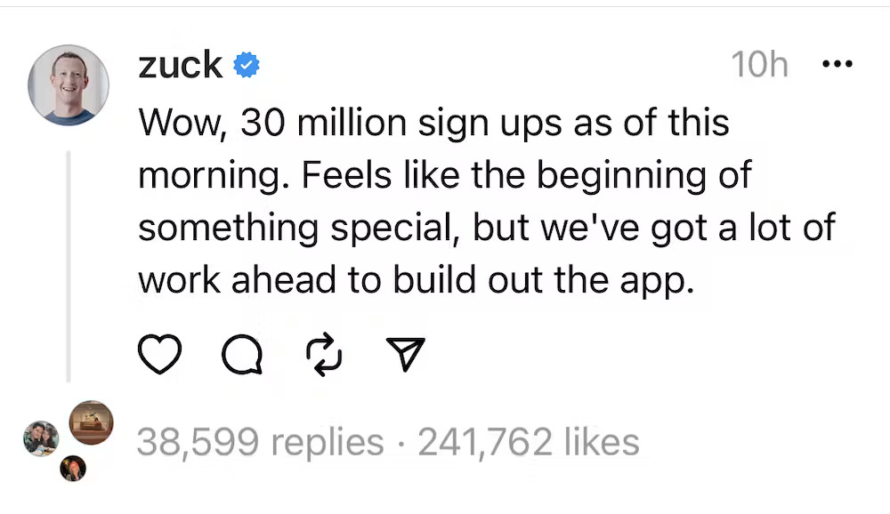 Mark Zuckerberg posted on Threads to celebrate its 30 million new users. Photo: Screenshot from Threads/The Conversation.