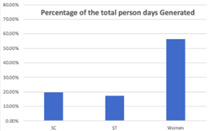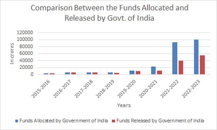 The above graph indicates a clear distinction between the funds allocated and funds released by the Union government. The funds released by the Union government are lower than the funds allocated for the scheme. From 2020, only around 50% of the allocated budget is released for the scheme. We can also see the upsurge in allocation from 2021. This is primarily done to alleviate the difficulties faced by rural households due to the COVID-19 pandemic.
