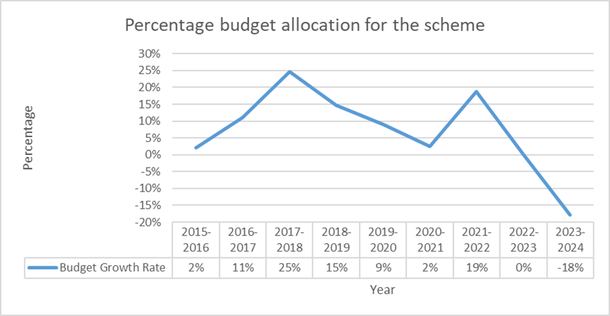The graph above illustrates an increasing annual gap between the demand for government-provided positions and the supply. This can be attributed to the declining budget allocations for the programme, as shown in the graph below. Consistent reductions in the government budget allocations have contributed significantly to the scheme's inability to create the promised number of jobs. The graph below depicts an 18% decrease in the budget allocation compared to the previous fiscal year.