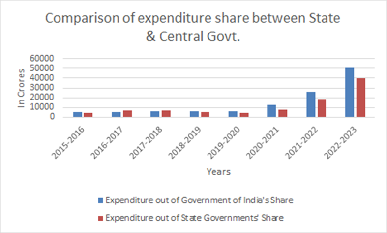 This graph indicates that the share of expenditure from the Union government and states had remained almost constant till 2020, but improved drastically from 2021, to address the issues that had arisen due to the COVID-19 pandemic. It could be seen that central and state expenditures improve more in 2022. This might be one of the vote bank politics techniques to increase the vote share from rural India in the 2024 Lok Sabha elections. There is a high probability of stagnation of expenditure from the state and the Union government.