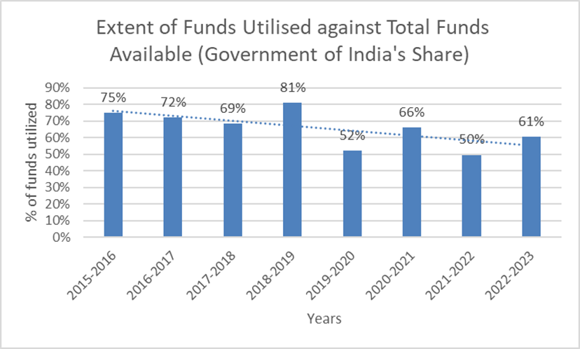 This graph indicates the percentage utilisation of government funds. It shows that the utilised funds have reduced over the years. The fund utilisation has reduced from 75% in 2015-16 to 61% in 2022-23. In 2021-2022, when the government expenditure surged significantly, only 50% of the funds were utilised.