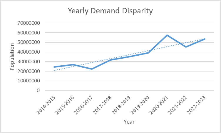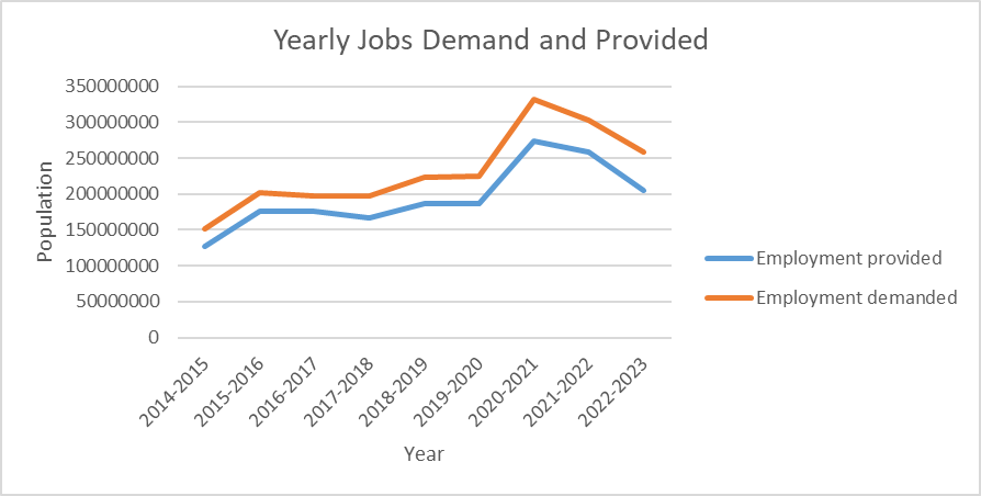 The graph illustrates a consistent trend in which the demand for jobs under the scheme consistently outpaces the actual number of jobs provided. From our analysis, it is evident that there has been a 41% increase in the job demand, while the number of jobs provided increased by 38%. A 3% difference can appear to be insignificant, but when viewed from the perspective of the entire population, it becomes substantial.