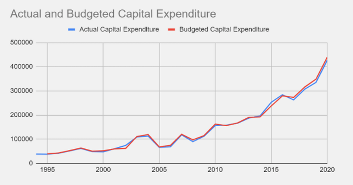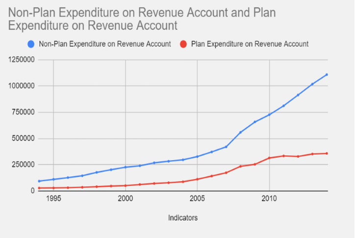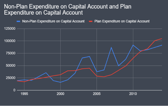 Capital expenditure (plan vs. non plan) follows a different pattern with actual and budgeted expenditure matching throughout the years, but, for revenue accounts, when we look at which of it was planned and unplanned, there is wide divergence in trend across the years-indicating a large increase in non-plan expenditure overheads (especially prior to 2015).