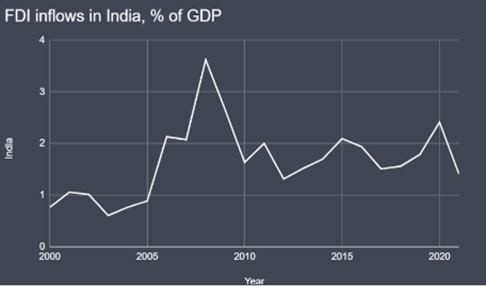 Still, attracting foreign direct investment on a sustained basis has been vital to the government’s efforts to driving higher growth. Fiscal interventions like cutting corporate tax rates or the use of PLI (Performance Linked Incentive) scheme hasn’t helped in driving FDI upwards too.