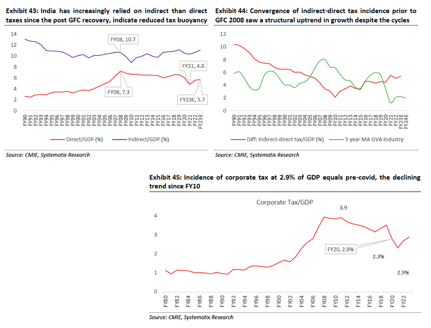 A structural part of the issue is also related to the skewed nature of India’s indirect-direct tax base. Convergence of indirect-direct tax incidence prior to the financial crisis of 2008 had seen a structural uptrend in growth despite the cycles (see the reference exhibits below).