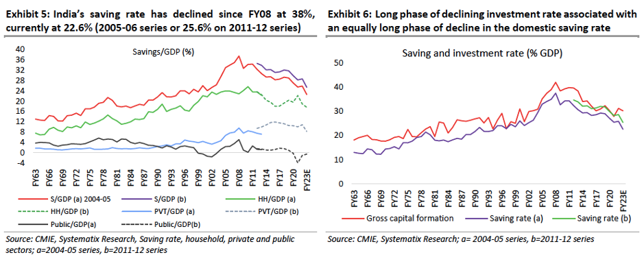 Given that domestic savings fund more than 98% of India’s capital formation, a revival in (domestic) savings will be extremely crucial for a revival in investments and potential real GDP growth.