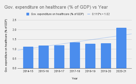 The Union public expenditure on healthcare in India was hovering around 1.2% of GDP since 2014. It was only around 2020-2021 that the overall expenditure rose above 2%. This was largely because of COVID-19-related spending that was temporal and did little to improve the overall medical (non-COVID-19) infrastructure.