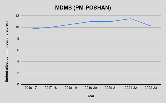To provide proper planning for the COVID-19 pandemic during Financial Year (FY) 2021–2022, there was an increase in PM POSHAN funds to 12,700 crore from 11,500 crore in the Budget Estimates (BEs). A budget of around Rs 10,234 crore has been approved for the Pradhan Matri Poshan Shakti Nirman (PM POSHAN) programme in 2022–2023. In FY 2022-23, the scheme is to be expanded to include pre-primary students.