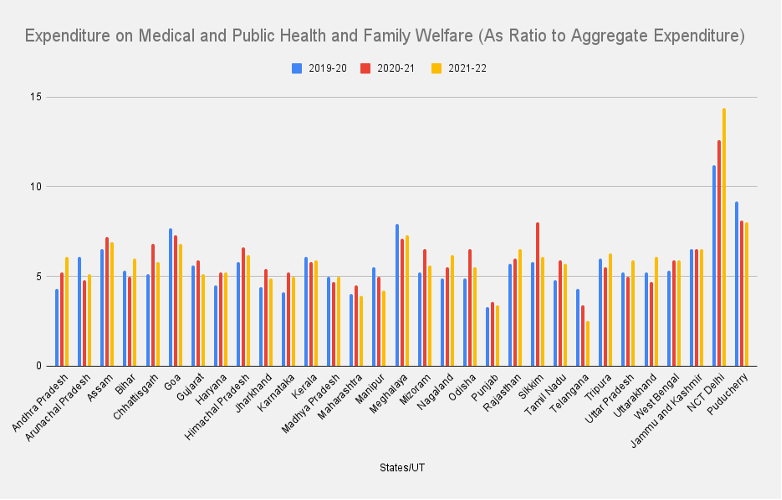The above figure illustrates state-wise expenditure on medical, public health and family welfare (as a ratio of aggregate expenditure, for the past three years).