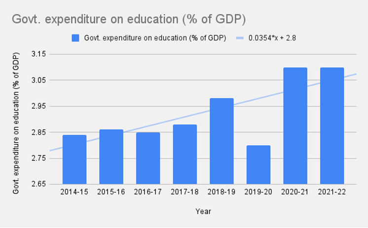 In the figure below, the measurable trend line slope is 0.035, indicating that the increase in spending over year-to-year is only by a margin of 0.035%. In comparison to the UPA-I and UPA-II terms, before 2014, the expenditure on education has decreased from a peak of 3.36% in 2012-13, to a low of 2.84 in 2014-15.