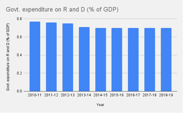 On research and development, as seen in the figure below, Union government expenditure since 2010-11 has been oscillating between 0.78% and 0.7% of GDP. It has always been under 1% of the GDP.
