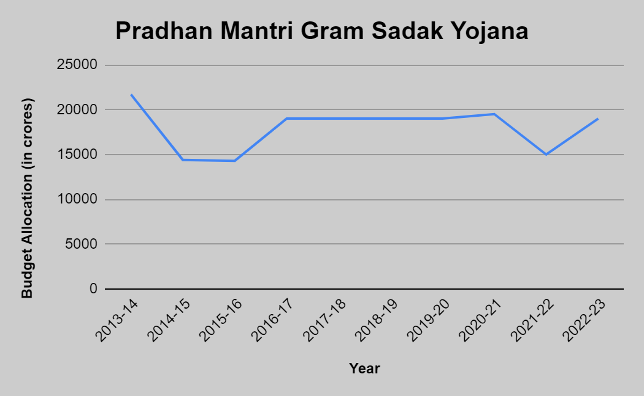 In the figure above, we see that the allocation to Pradhan Mantri Gram Sadak Yojana (PMGSY), the rural roads construction scheme, in the budget for the year 2022-23 has been raised by a stupendous 36 per cent to Rs 19,000 crore. Although the allocation for 2022–23 is significantly higher than the revised forecasts from the previous year, the program's spending has been falling since 2015–16.