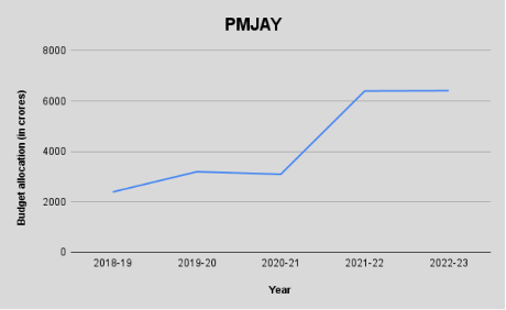 As seen in the figure above, in 2022-23, PMJAY has been allocated Rs 6,412 crore - this is double the estimates of 2021-22 (Rs 3,199 crore). Experts are predicting that this amount may be low considering the expenditure required on PMJAY.