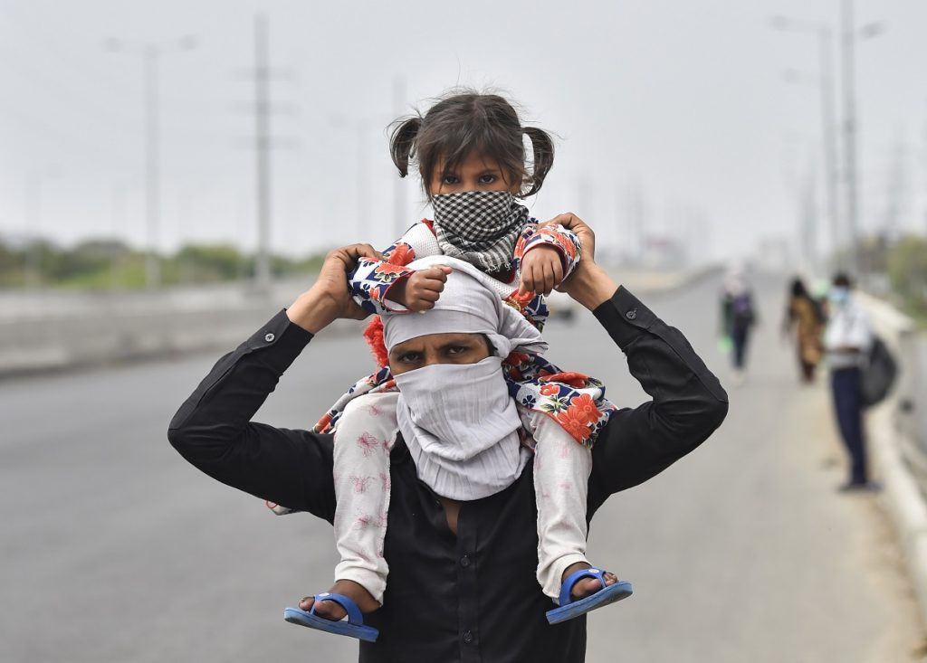 A worker with a child on his shoulder walks to his village amid a nationwide complete lockdown, on the NH24 near Delhi-UP Border in Ghaziabad, March 26, 2020. Photo: PTI Photo/Ravi Choudhary