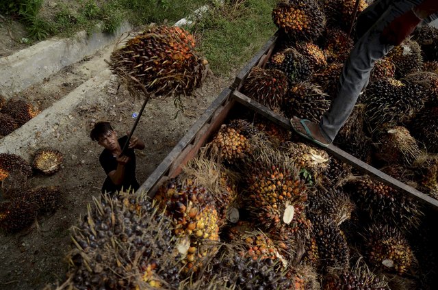 A worker loads palm fruit at a palm oil plantation in North Mamuju regency, West Sulawesi, Indonesia. Credit: Reuters
