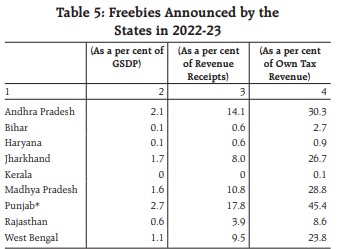 Andhra Pradesh, Madhya Pradesh and Punjab, for instance, incur a very high subsidy bill by doling out freebies that go over and above 10% of their total revenue receipts. The three states respectively give away freebies worth 14.1%, 10.8% and 17.8% of their revenue income. Gujarat and Chhatisgarh also spend over 10% of their revenue on giving away subsidies to their citizens. For states like Andhra Pradesh and Punjab, already battling the scourge of heavy indebtedness, freebies are hollowing out the state government’s coffers from the inside as the dole out is steadily inching up to more than 2% of the GSDP.
