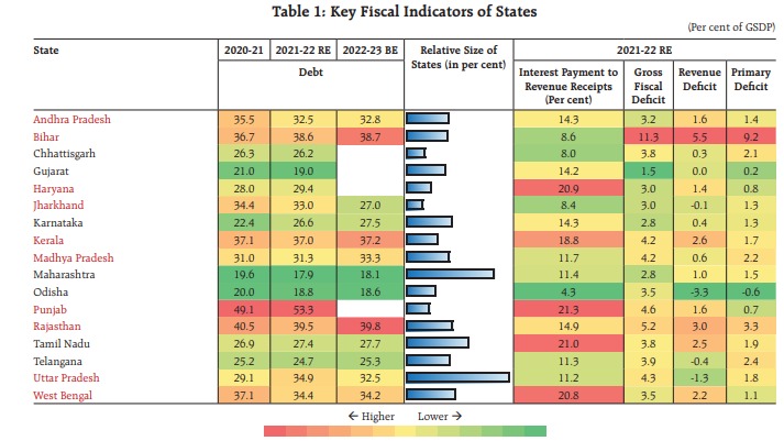 What’s more, their GFD:GSDP ratio was equal to or more than 3% in 2021-22, not to mention the deficits in revenue accounts further adding to the worsening economic condition of the states. Lastly, for eight of these ten states, the interest payments to revenue receipts ratio (IP-RR), a measure of the debt servicing burden on the state’s finances, was more than 10%.