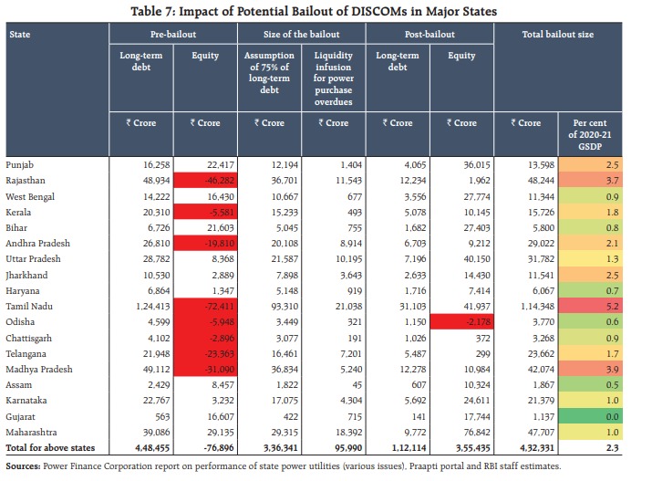 “For instance, if: (i) 75 per cent of the long-term debt of the DISCOMs (as at end-March 2020) is taken over by the state governments (similar to UDAY); and (ii) the states infuse liquidity (in the form of equity) into the DISCOMs to the tune of overdue outstanding to the GENCOs as of April 2022, the burden on the exchequer will be significant. For the 18 major states, the cost of the bailout will be 2.3 per cent of their combined GSDP, though there are significant differences amongst states. Tamil Nadu, Madhya Pradesh, Rajasthan and Punjab are most vulnerable to a possible bailout while Gujarat, Assam, Haryana and Odisha are relatively insulated from this risk.”