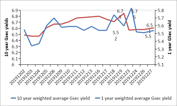 The chart below shows the movement in 10 year GSec yields in the month of December. The weighted average 10 year GSec yields have seen a decline of 24 bps from 6.75% on December 19 (date of announcement of Indian Operation Twist) to 6.51% on December 27. On the other hand, the weighted average 1 year GSec yields which rose immediately after the announcement by 23 bps, have moderated subsequently and ended at 5.5% on December 27.