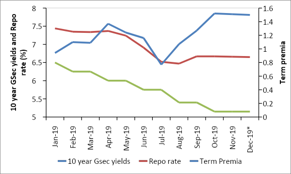 Chart 1: Weighted average 10 year GSec yields vs Repo rate vs Term premia for the year
