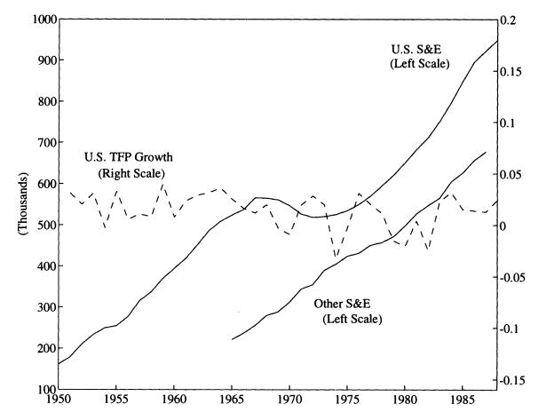 Figure 1: Scientists and Engineers (S&E’ s) engaged in R&D and U.S TFP growth from 1950-1990. U.S TFP growth has virtually stayed constant but the number of S&E’ s employed has steadily increased. Source: 'R&D Based Models of Economic Growth' (1995, C.I Jones)