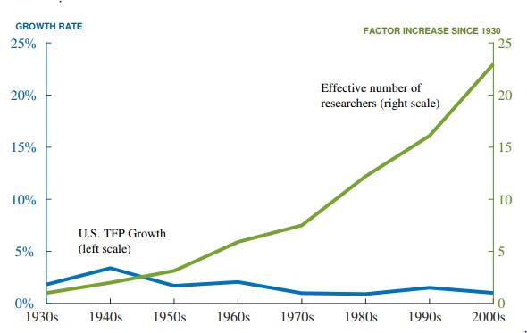 Second, what the authors measure here is not technically the difficulty of getting new ideas but rather the onerous task of developing them further as they mature. Third, the TFP measure is also a reflection of our measure of ignorance. This ignorance covers many components, some wanted (new technical innovations, higher R&D output), others unwanted (measurement errors, model misspecification). Therefore, to rely on TFP growth as a sole indicator of technological progress may very well be misleading.