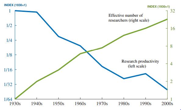 First, US real GDP was a little over $2 trillion in 1950, from which it has grown to over $17 trillion today. As a result, the same magnitude of economic growth today implies a much larger increase in income in absolute terms. Therefore, the fact that higher research effort is required to maintain the same level of economic growth can be explained by the large base the US economy possesses. In this sense, the paper just reaffirms our understanding that as an economy grows, an increasing amount of investments in R&D is needed to push the economy forward.