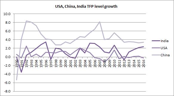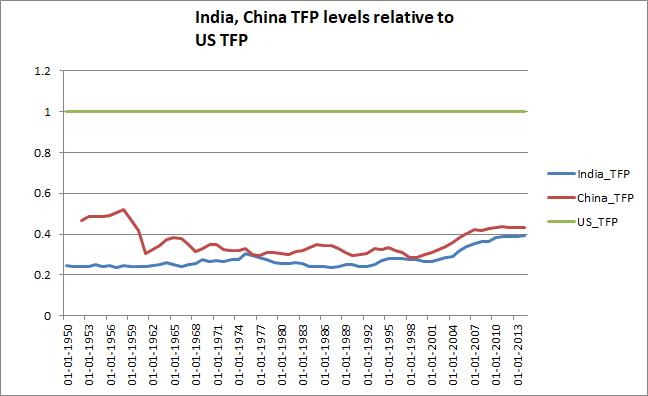 Figure 4: Total factor productivity levels of India, China relative to the United States. Note that these are levels, not growth rates. India’s TFP levels are below those of China and nearly two-fifth to that of U.S. Source: Authors calculations and Penn World Table 9.0
