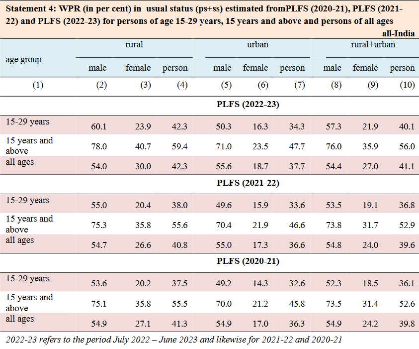 WPR for persons of age 15 years and above has increased to 56% in 2022-23 from 52.9% in 2021-22 and 52.6% in 2020-21.