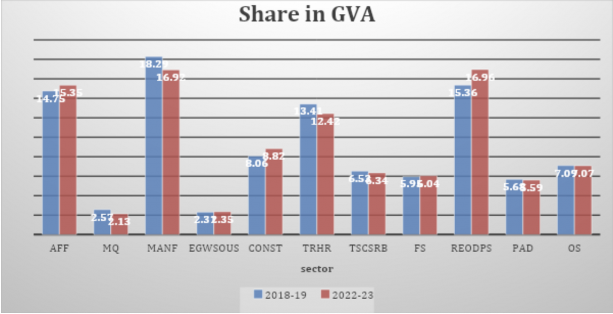 While the share of employment in the construction sector increased from 11% to 13%, that of output hovered around 8%. At the same time, the manufacturing sector also saw its share in output and employment reducing from 18% to 17% and 13% to 11% respectively between 2018-19 and 2022-23.