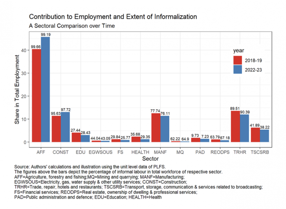 Construction, the other pivotal contributor to employment generation, is also highly informalized with its extent of informalisation marginally rising between 2018-19 and 2022-23. Further, trade, repair, hotels and restaurants, road transport, real estate, and professional services largely generate informal jobs. Note that, sectors which have contributed significantly to overall growth during this period — all of them are highly informal and for several of these sectors informalisation has actually increased in the last two years. On the contrary, sectors where the percentage of informal labour is relatively lower are not generating enough employment. For example, railways, aviation transport, public administration and defense, education and health care sectors, are relatively formal but their contribution to overall employment is miniscule, hovering around 1 to less than 2% and indicates a further decline overtime. A welcoming exception is the financial service sector, where the extent of informalisation has reduced considerably but again its contribution to overall employment is also dismally low.