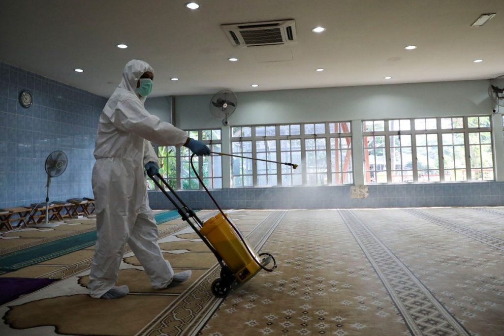 A worker sprays disinfectant at a mosque, which is closed during the movement control order due to the outbreak of (COVID-19) in Kuala Lumpur, Malaysia. Photo: Reuters/Lim Huey Teng