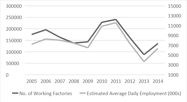 Figure 2. Number of Working Factories (Submitting Returns) and Estimated Average Daily Employment (000s), 2005-14