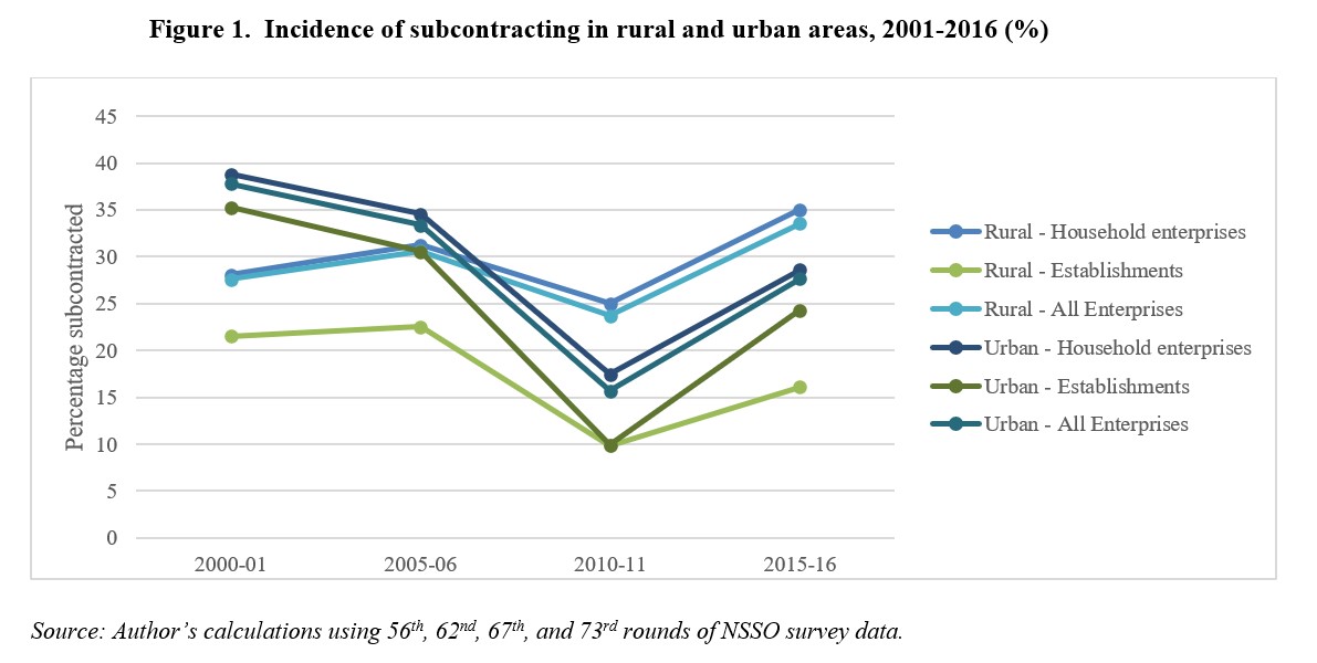 Less than 30% of informal enterprises have been in a subcontracting relationship at any point of time during 2001-2016. During this period, the incidence increased slightly in rural areas but fell by nearly 10 percentage points in urban areas (Figure 1).