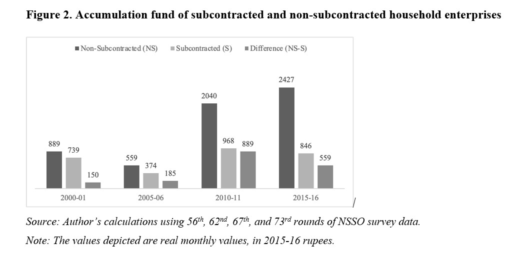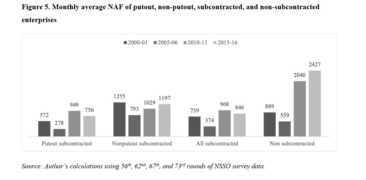 However, note that despite there being a striking gap between put-out and non-put-out subcontracted enterprises at the beginning of the period, the gap has somewhat narrowed over time due to a stagnancy in the net accumulation fund (NAF) of the latter. Therefore, being in a put-out relationship not only appears to be a dominant form of subcontracting in the informal sector, alternative, more autonomous subcontracting relationships also seem to have ceased to offer a significantly better alternative in terms of growth possibilities.
