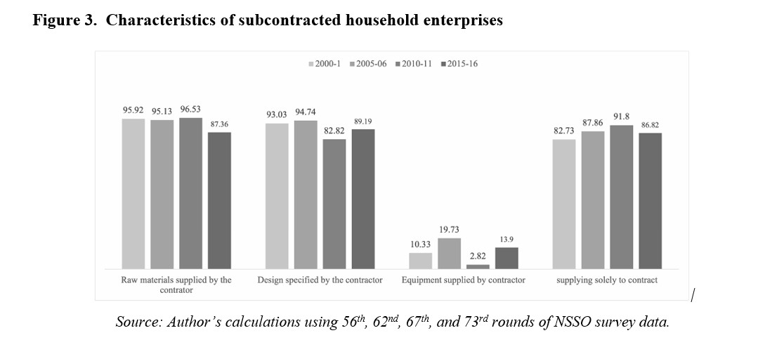 In recent research (Kesar 2024), I study the pattern and nature of subcontracting linkages in informal household enterprises in India's manufacturing sector – how these linkages have evolved, and whether they are of the dynamic kind that can play the expected role of facilitating accumulation, growth, and potential transition of these enterprises. To do this, I analyse data from repeated cross-sections of four rounds of the NSSO’s quinquennial survey of unincorporated enterprises, covering a period of India’s high economic growth from 2000-01 to 2015-16.[1]