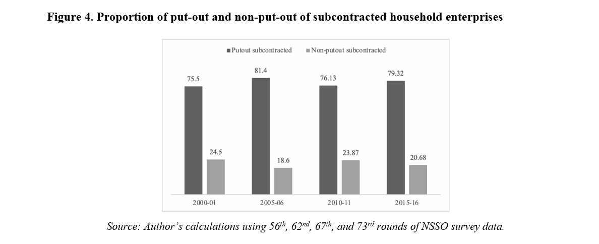 Given the relatively disadvantaged position of women, who face barriers to accessing credit and markets due to social norms and patriarchal structures, as well as for those located within households, being in a put-out relationship offers assured demand for products. However, being embedded in such relationships is associated with the least autonomy and lowest possibility among all household enterprises to grow and transition into larger enterprises. From the parent firm’s perspective, such linkages effectively subsidise their production costs by contracting to home-based female workers that have lower bargaining power and by gaining access to non-commodified household resources, such as tools and space.